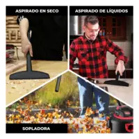 Este modelo incluye filtro seco reutilizable y capacidad de 2.5 galones (9.4 litros), ideal para trabajos continuos. Su manguera de 1.2 metros y accesorios especializados (boquilla multiusos, para rincones y soporte de pared) garantizan limpieza profunda en cualquier superficie. Con flujo de aire de 60 CFM, elimina residuos rápidamente sin perder succión.