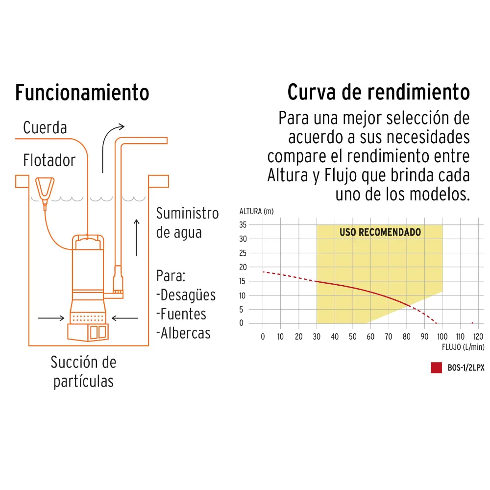 | Características | Diseñada para uso doméstico e industrial como en cisternas, fuentes, albercas, oxigenación y circulación de agua. Altura máxima: 18 m. Flujo máximo: 97 L/min. Profundidad de inmersión máxima: 5 m. Rejillas filtradoras de partículas. |