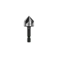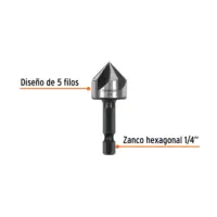 | Características | Fabricado en acero de alta velocidad (HSS). Diseño de 5 filos para corte rápido y avellanado limpio. Ayuda a ocultar la cabeza del tornillo. Zanco hexagonal de cambio rápido. Ángulo de punta 82°. |