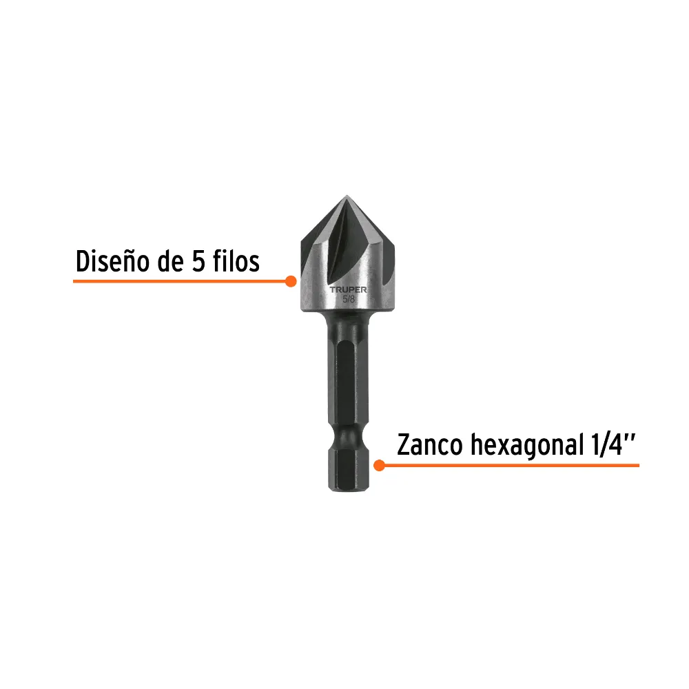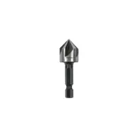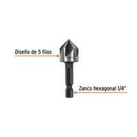 | Características | Fabricado en acero de alta velocidad (HSS). Diseño de 5 filos para corte rápido y avellanado limpio. Ayuda a ocultar la cabeza del tornillo. Zanco hexagonal de cambio rápido. Ángulo de punta 82°. |