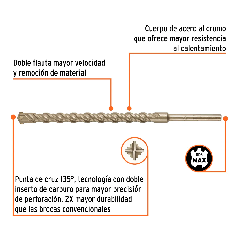 • Broca para concreto con tecnología SDS Max, diseñada para perforaciones de alto impacto y mayor productividad.
