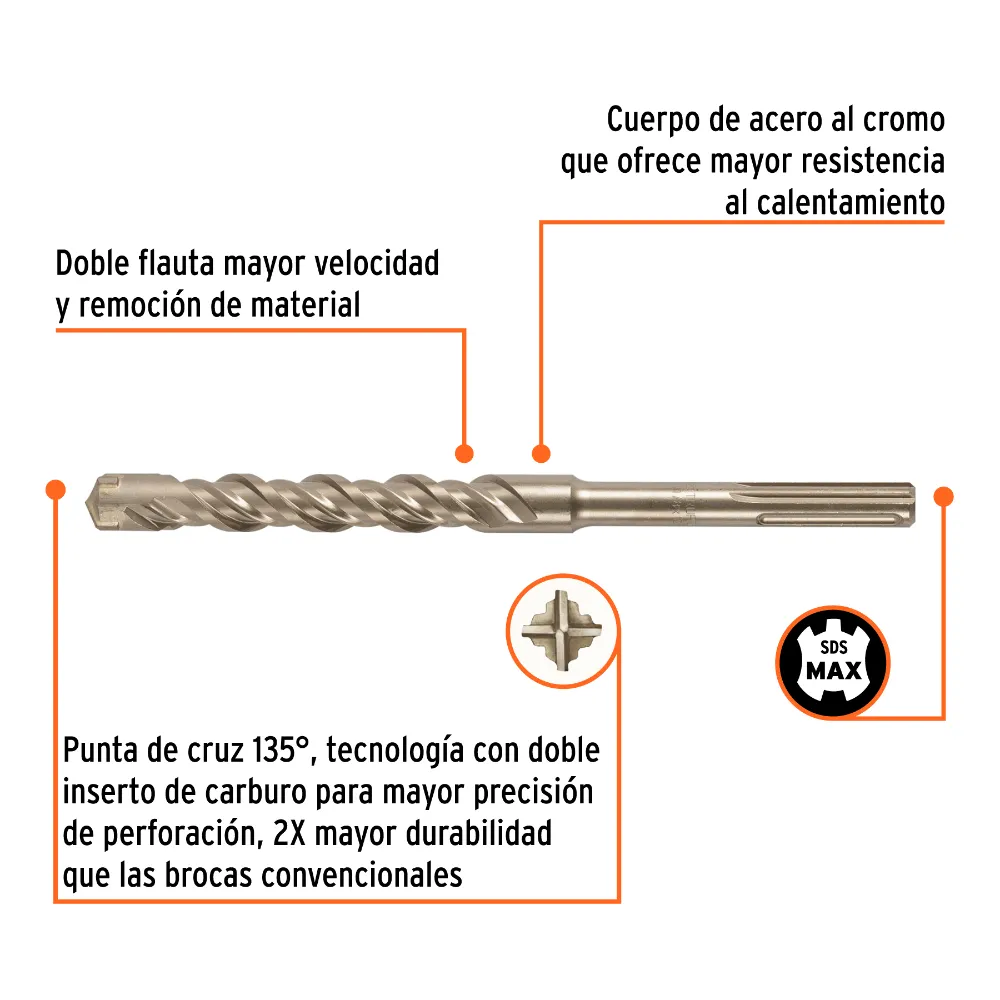• Broca con tecnología SDS Max para perforación de alto impacto en concreto, mampostería y piedra.