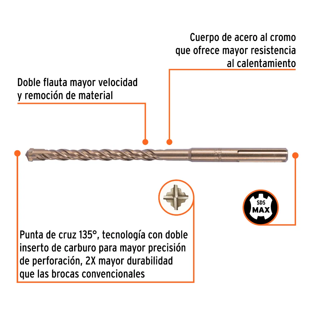 | Características técnicas | Tecnología con doble inserto de carburo para mayor precisión de perforación, 2x mayor durabilidad que las brocas convencionales, Mayor resistencia al calentamiento, Mayor velocidad y remoción de material |