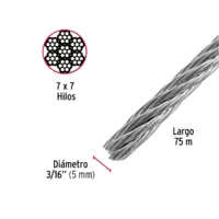Con una carga de trabajo máxima de 1,320 kg y un diámetro de 3/16″ (5 mm), este cable de torsión regular de 7 x 7 hilos está diseñado para aplicaciones que demandan rigidez y resistencia. Su largo de 75 metros lo hace ideal para proyectos de gran envergadura, proporcionando flexibilidad y seguridad en el manejo de cargas.