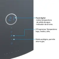 • Calentador de agua principal (modelo WHD 7125) – Sistema digital de calentamiento instantáneo a gas con pantalla LED.