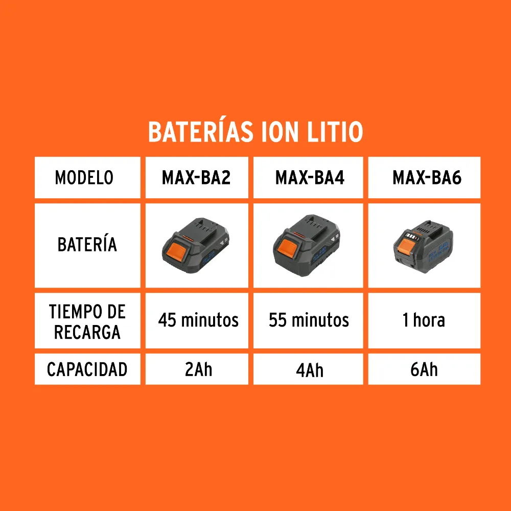 • Ofrece una recarga ultrarrápida: carga la MAX-BA2 en 45 minutos, la MAX-BA4 en 55 minutos y la MAX-BA6 en 1 hora.