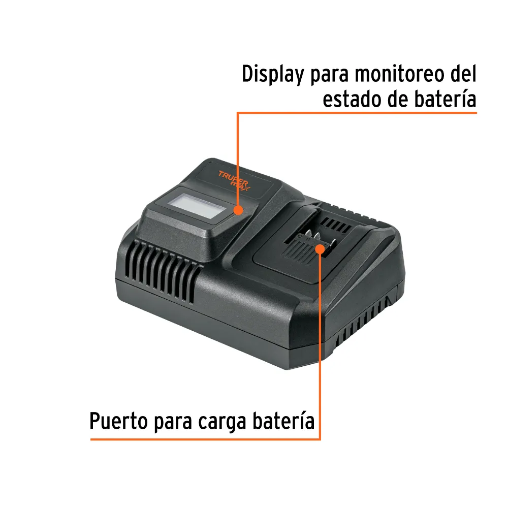 • Cargador rápido de baterías de ion litio con un voltaje de 20V, compatible con las baterías TRUPER MAX modelos MAX-BA2, MAX-BA4 y MAX-BA6.