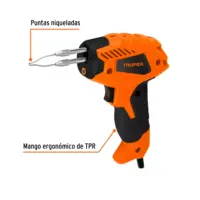 Potencia y ergonomía se unen en este cautín tipo pistola de 50W, diseñado para trabajos de soldadura ligeros con resultados profesionales. Su diseño compacto y ligero lo convierte en la herramienta ideal para aficionados y técnicos que valoran la precisión y el confort durante proyectos extensos.