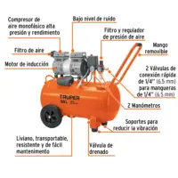 | Características | Motor monofásico de 2 HP con bobinas de cobre 2X mayor durabilidad, Presión máxima de operación 116 psi, Presostato con 2 manómetros (presión máxima del tanque y presión de salida regulable), Encendido manual y automático para que el compresor siempre mantenga aire y presión, 2 Conexiones rápidas de autobloqueo de latón con salida de 1/4″ |