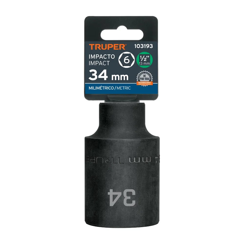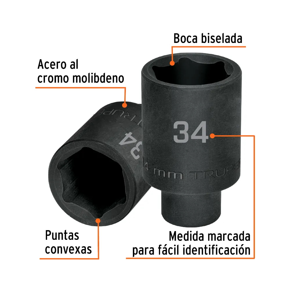 Fabricada en acero al cromo molibdeno con acabado fosfatado, ofrece máxima resistencia a la corrosión y al desgaste. Su sistema de sujeción Truper-Drive con puntas convexas aumenta el torque de forma segura sin dañar tuercas ni cabezas de tornillos, ideal para herramientas de impacto.