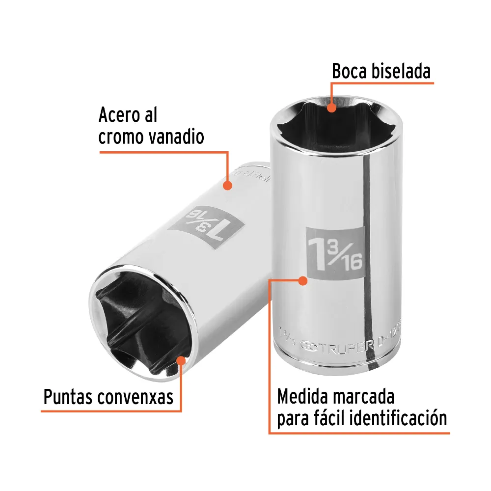 | Características | Fabricado en acero al cromo vanadio con acabado pulido espejo resistente a la oxidación y de fácil limpieza, Sistema de sujeción Truper-Drive con puntas convexas que aseguran y aumentan el torque sin dañar tuercas ni cabezas de tornillos, Medida marcada para fácil identificación, Boca biselada para acoplamientos rápidos |