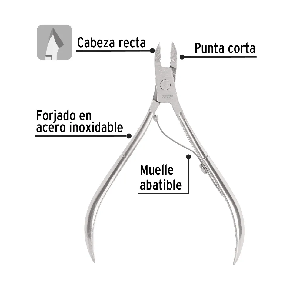 | Características | Forjado en acero inoxidable. Punta corta con cabeza recta. Muelle abatible. Para áreas con cutículas grandes. |