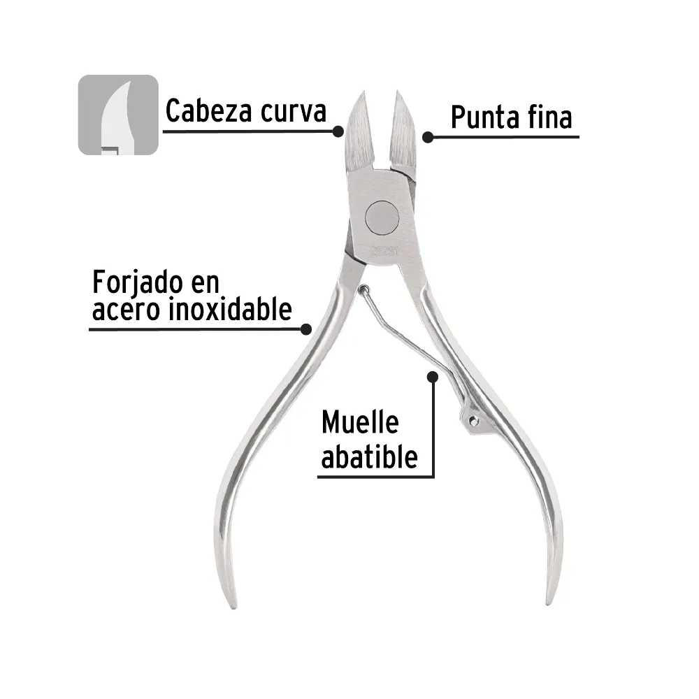 | Características | Forjado en acero inoxidable. Punta fina con cabeza curva. Muelle abatible. Facilita el corte de uñas gruesas, cutículas y piel muerta. |