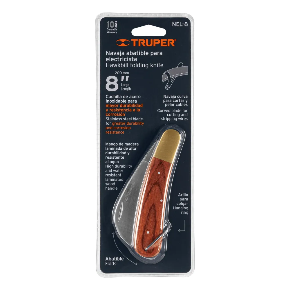 | Características | Hoja de acero inoxidable resistente a la corrosión y desgaste, brinda mayor durabilidad del filo, Mango fabricado en madera de Pakka fácil de limpiar, de gran durabilidad y alta resistencia al calor y la humedad, Arillo para colgar, Ideal para cortar y pelar cable |