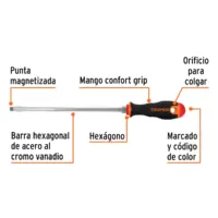 Con un mango Comfort Grip, este destornillador proporciona un agarre cómodo y seguro, además de contar con un orificio para colgar, facilitando su almacenamiento. El marcado y código de color en la punta permiten una fácil identificación de la medida, optimizando el tiempo en tus proyectos. Su diseño hexagonal maximiza el torque cuando se utiliza con una llave, mejorando la eficiencia en trabajos exigentes.