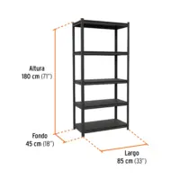 Maximiza el espacio de tu hogar, taller o oficina con el Estante Metálico Truper de 5 niveles. Su diseño robusto y funcional ofrece la solución perfecta para almacenar herramientas, materiales, cajas y más, manteniendo todo ordenado y al alcance de tu mano.
