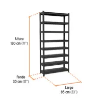 Cada repisa soporta hasta 80 kg de peso de forma distribuida, proporcionando una base sólida y segura para tus pertenencias más valiosas. Con unas dimensiones generosas de 180 cm de alto, 85 cm de largo y 30 cm de fondo, este estante ofrece una capacidad de almacenamiento excepcional para uso en interiores.