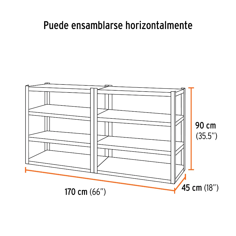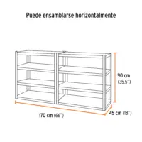 | Características | Estructura y repisas metálicas con acabado en pintura electrostática resistente a la oxidación y rayaduras, Ensamble sin tornillos, fácil y rápido, No manipule ni mueva la carga una vez que haya sido puesta, Uso en interiores |