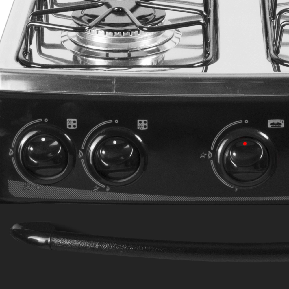 4 quemadores profesionales (3 rápidos + 1 ultra rápido) con base en aluminio. Puerta de horno panorámica con doble vidrio de seguridad y aislamiento térmico.