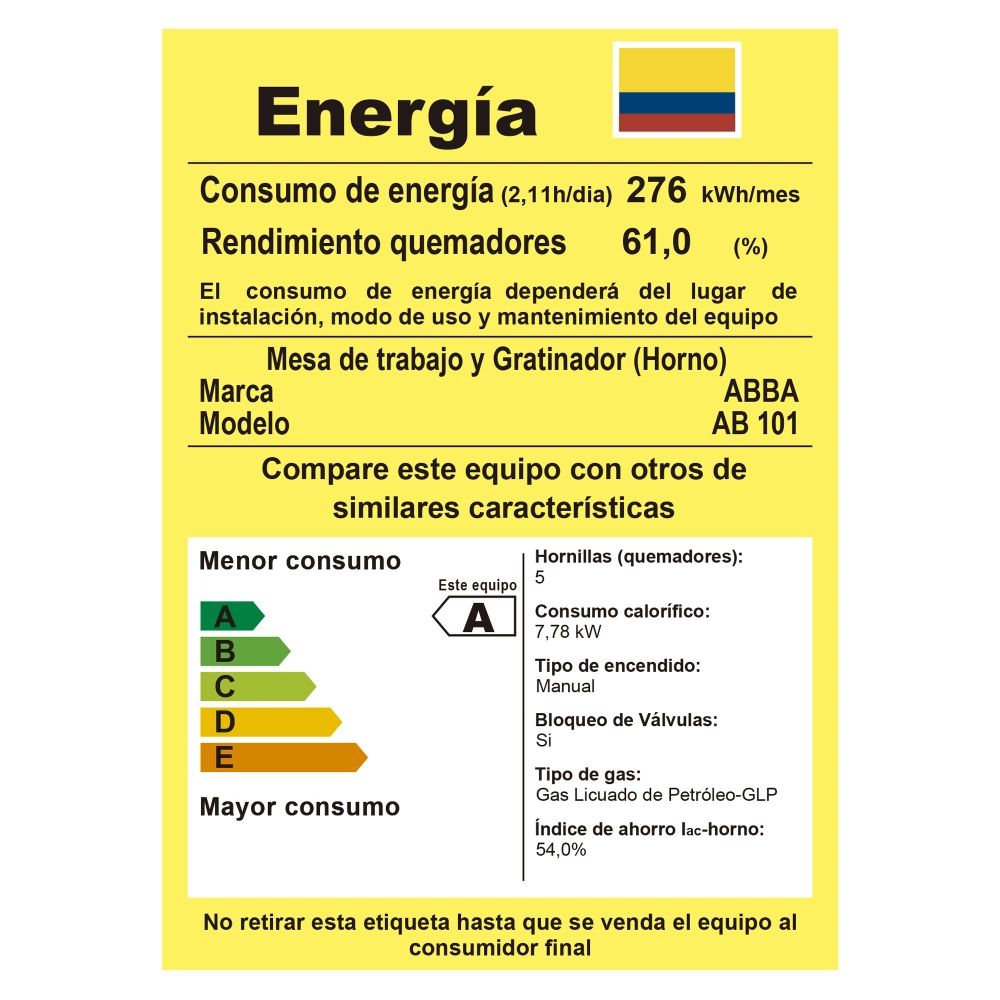 | Materiales | Mesa en acero inoxidable 430, quemadores de aluminio |