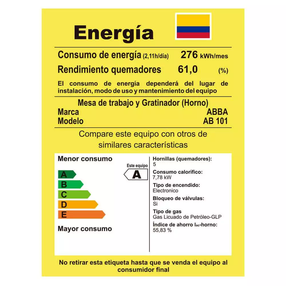 | Materiales | Mesa en acero inoxidable 430, quemadores de aluminio |