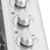 Su mesa sellada en acero inoxidable 430 con niveles antiderrame facilita la limpieza, mientras que las parrillas dobles en hierro fundido garantizan durabilidad y estabilidad. Las perillas ergonómicas con acabado metálico aportan comodidad y un toque elegante. Los quemadores, incluyendo uno triple corona, aseguran una cocción rápida y eficiente con máxima seguridad gracias a su sistema de combustión tipo copa y encendido automático.