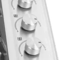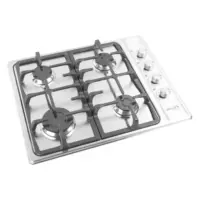 Superficie en acero inoxidable 430 con protección antiderrames para fácil mantenimiento. Parrillas dobles en hierro fundido que ofrecen estabilidad superior y distribución uniforme del calor. Perillas ergonómicas en imitación cromo para un acabado elegante.