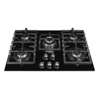 Mesa en vidrio de seguridad negro resistente a altas temperaturas, con parrillas dobles en hierro fundido para mayor estabilidad. Perillas ergonómicas en imitación cromo que añaden un toque de elegancia a tu cocina.