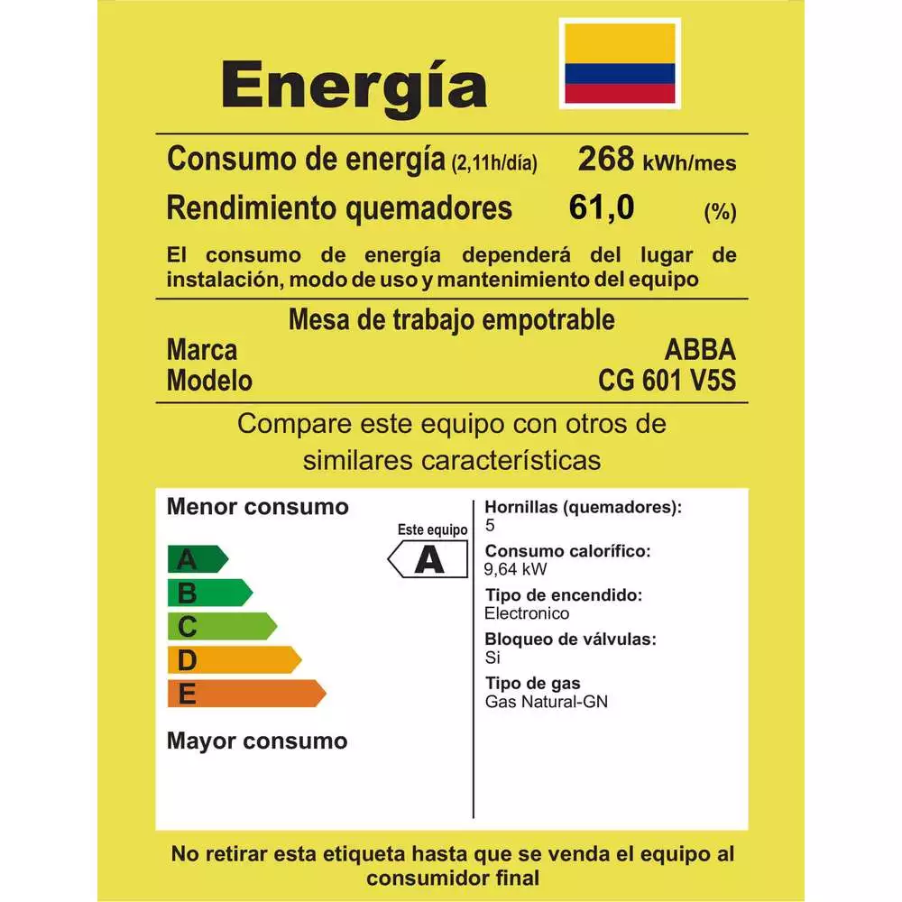 Equipada con 4 quemadores rápidos y 1 ultra rápido para diversas técnicas culinarias. Sistema de combustión tipo copa que garantiza un consumo eficiente (268 kWh/mes) con clasificación energética A, ideal para uso frecuente.
