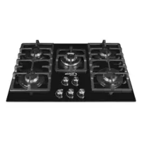 Mesa en vidrio de seguridad negro resistente a altas temperaturas, con parrillas dobles en hierro fundido para mayor estabilidad. Perillas ergonómicas en imitación cromo que complementan cocinas modernas.