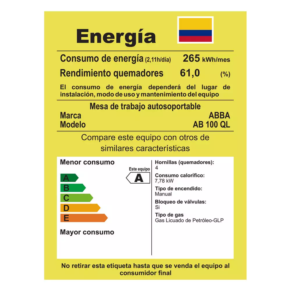| Características | Mesa curva sellada antiderrame, parrillas en alambrón porcelanizado, gabinete multiusos |