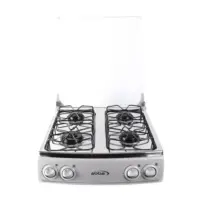 | Materiales | Mesa curva sellada en acero inoxidable 430, parrillas en alambrón porcelanizado, base de quemadores en lámina, tapas en acero porcelanizado, tapa en vidrio de seguridad |
