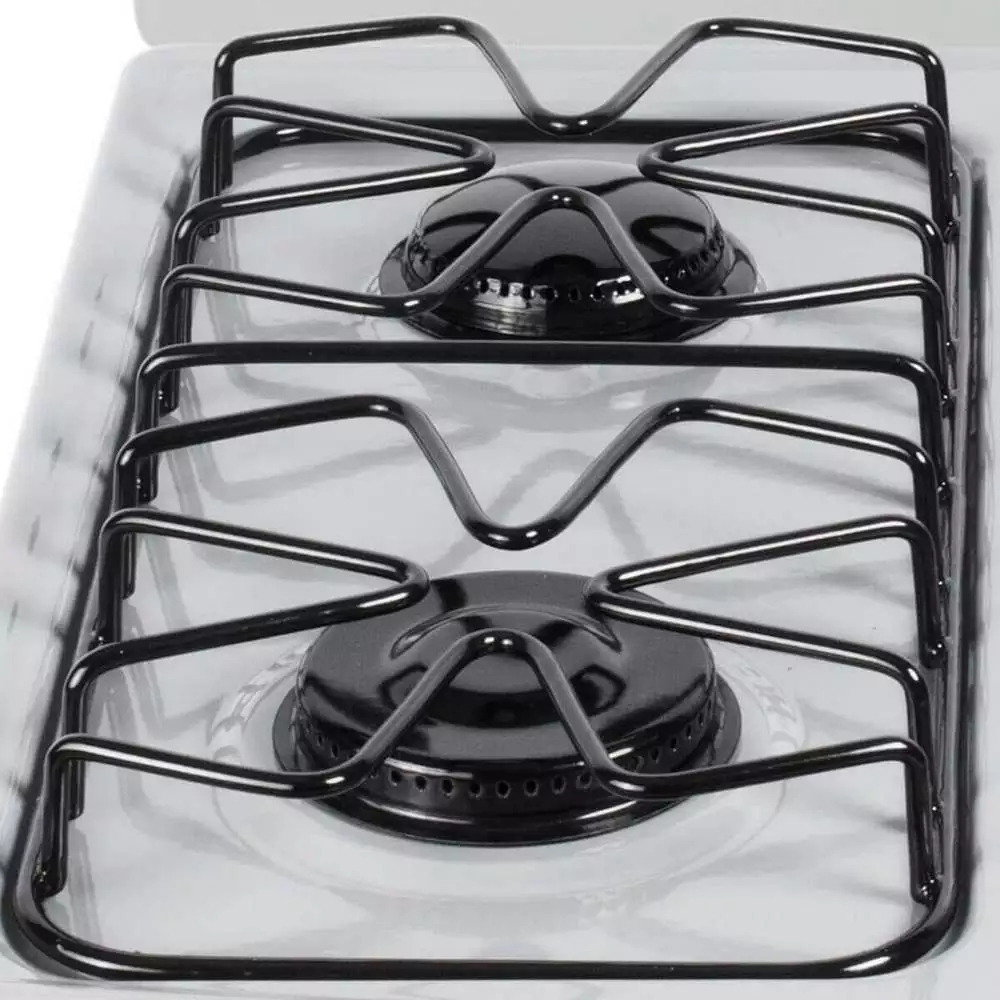 Su mesa curva sellada con niveles antiderrame permite una limpieza rápida y sin complicaciones. Además, cuenta con dos parrillas dobles en alambrón porcelanizado que garantizan estabilidad al cocinar. Los cuatro quemadores (tres rápidos y uno ultra rápido) operados por válvulas de seguridad ofrecen una cocción segura y uniforme para cualquier receta.