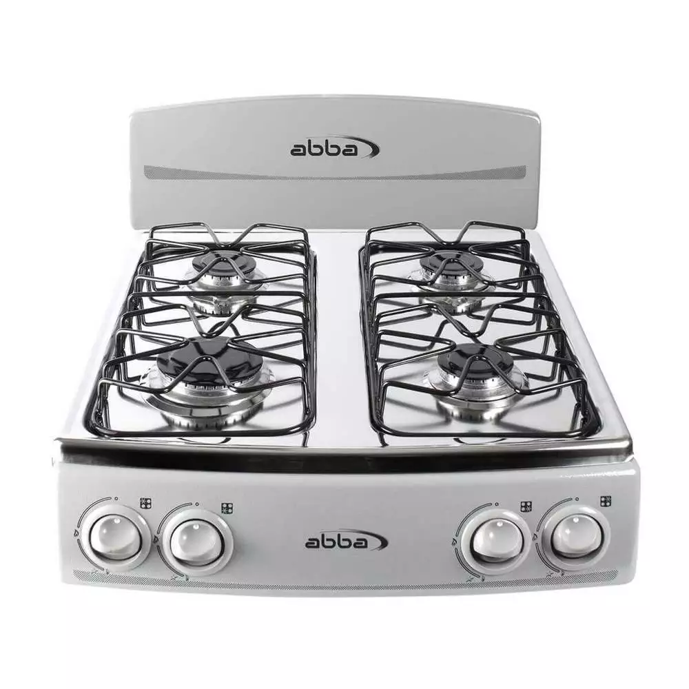 Optimiza tu cocina con la Estufa de Sobreponer Abba 4 Puestos para gas propano, diseñada para ofrecer funcionalidad y facilidad de limpieza con su elegante acabado en acero inoxidable gris.
