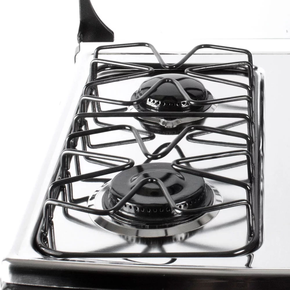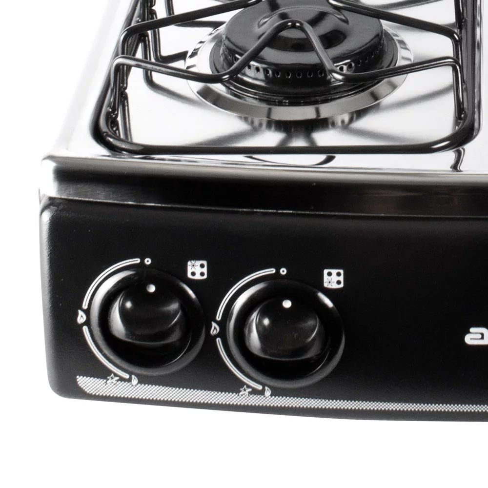 Destaca por su tapa en vidrio de seguridad que protege y añade un toque moderno. El sistema de combustión tipo venturi optimiza el consumo de gas propano, y las válvulas de seguridad con perillas ergonómicas aseguran operación protegida. Compacta (51 x 58 x 17.8 cm) y con elegante color negro, ideal para espacios reducidos.