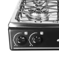 Diseñada con mesa plana en acero inoxidable 430, sellada y con niveles antiderrame para facilitar la limpieza. Incorpora dos parrillas dobles en alambrón porcelanizado, perillas ergonómicas y un sistema de combustión tipo venturi. Sus quemadores con base en aluminio y tapas en acero porcelanizado garantizan durabilidad y distribución uniforme del calor.