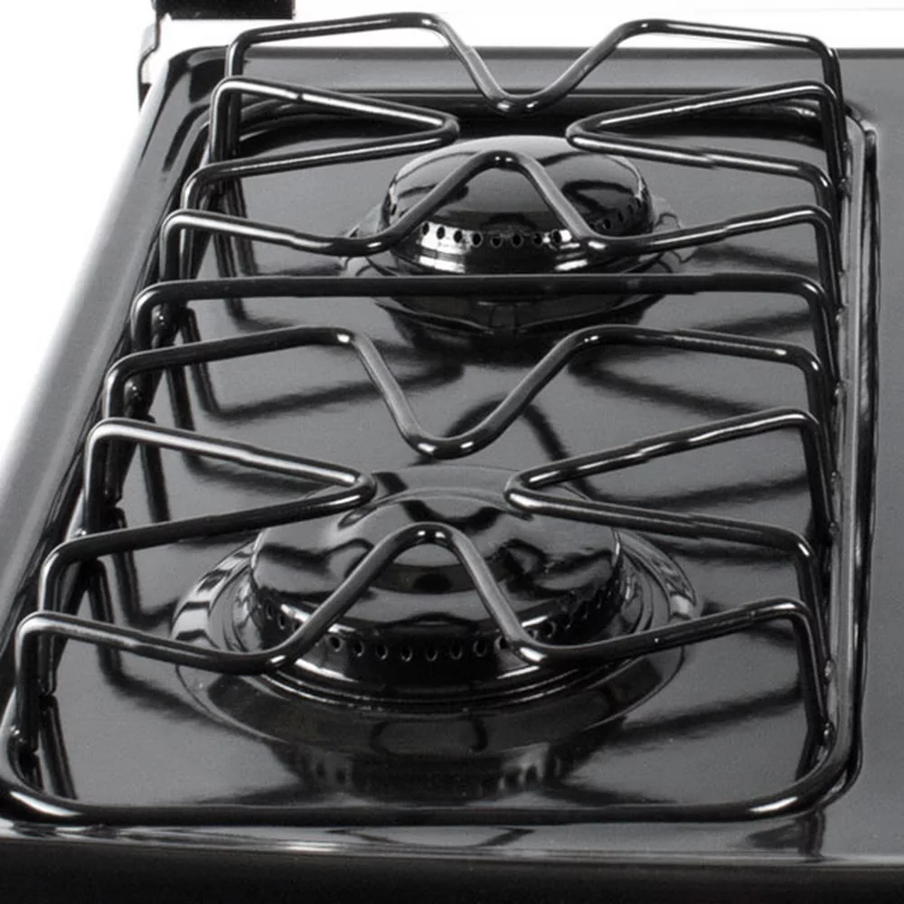 Cuenta con una mesa curva porcelanizada con niveles antiderrame, que facilita la limpieza. Sus dos parrillas (una doble y una sencilla) de alambrón porcelanizado brindan soporte y estabilidad al cocinar.