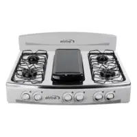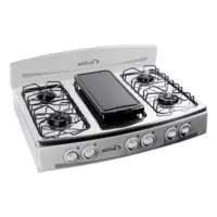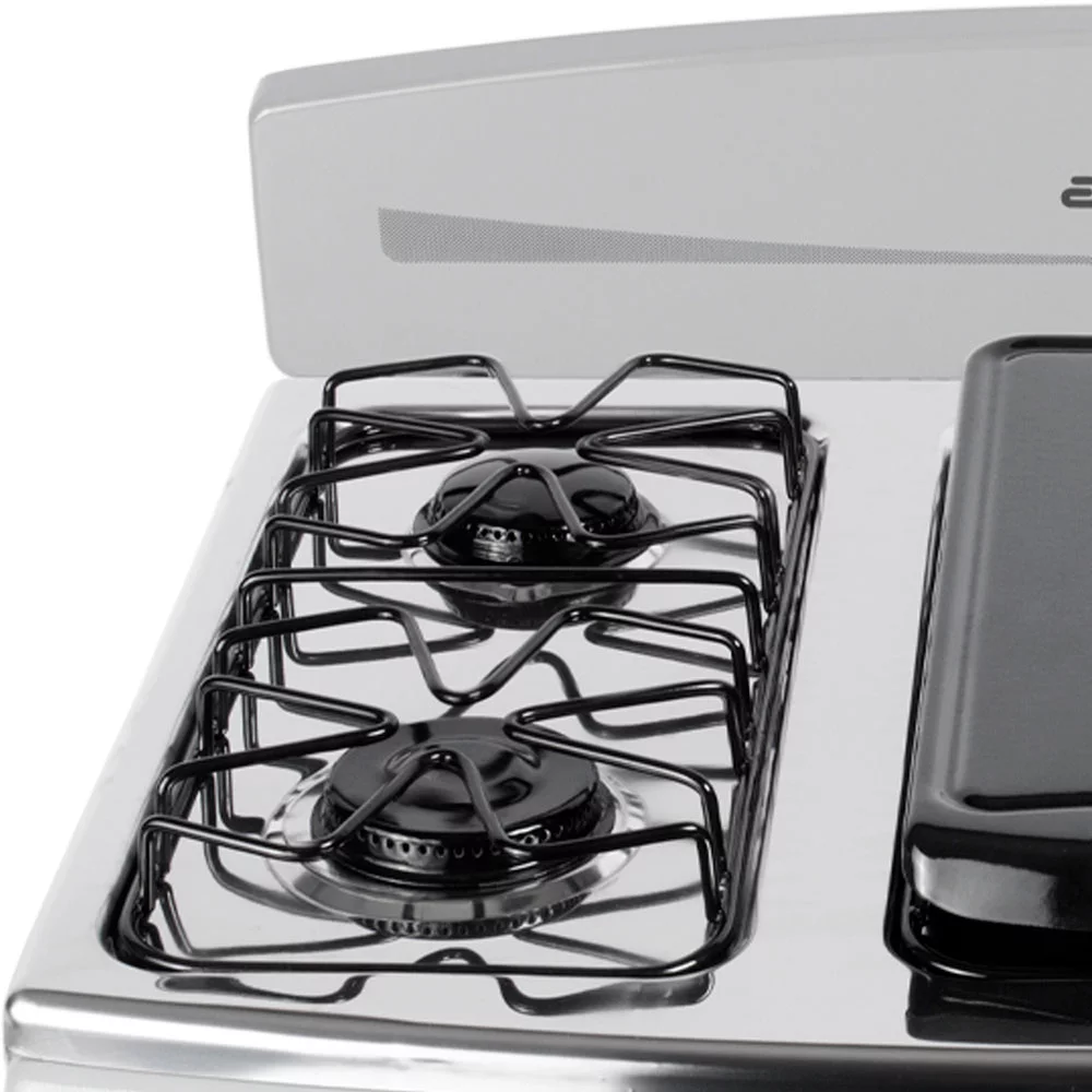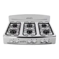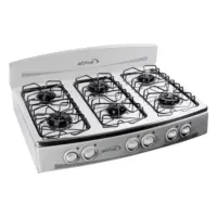 | Materiales | Mesa curva sellada en acero inoxidable 430, tres parrillas dobles en alambrón porcelanizado, quemadores con base en lámina y tapas en acero porcelanizado, bandeja en lámina esmaltada |