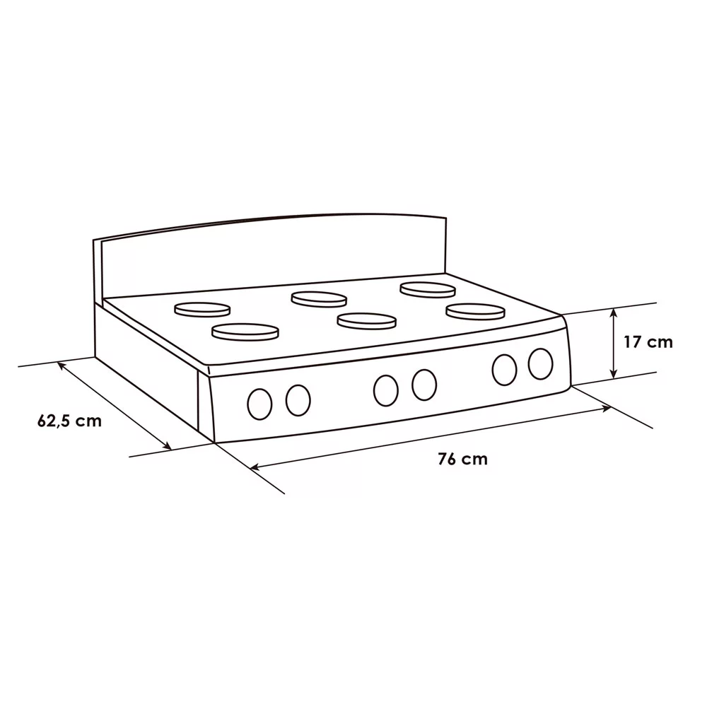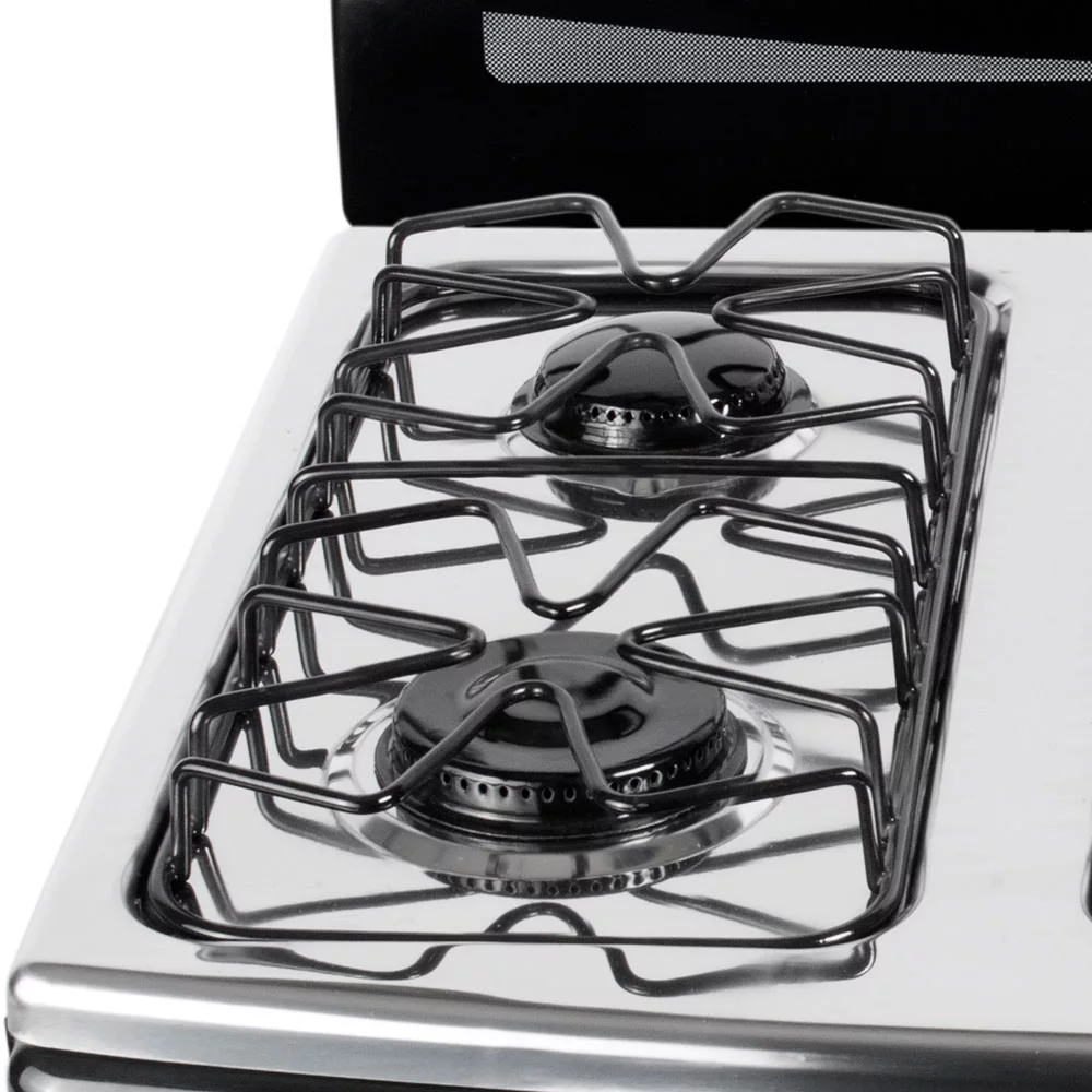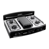 | Materiales | Mesa curva sellada en acero inoxidable 430, tres parrillas dobles en alambrón porcelanizado, quemadores con base en lámina y tapas en acero porcelanizado, bandeja en lámina esmaltada |