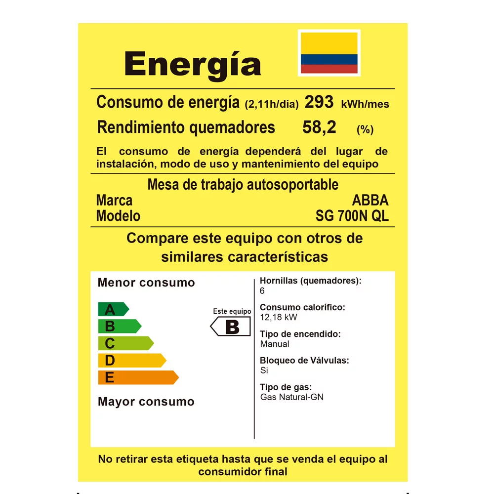La Estufa Abba SG 700-5N N QL redefine la eficiencia en tu cocina con sus 6 puestos y tecnología avanzada. Con mesa curva en acero inoxidable 430 y sistema de combustión Venturi, ofrece máximo rendimiento para gas natural en un diseño profesional.