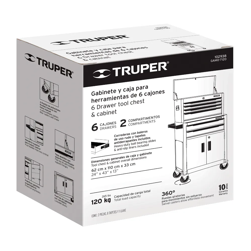 | Características | Cuerpo de acero con manubrio superior para mayor control. 6 Cajones con correderas de baleros de suave operación. 2 Compartimentos con puertas de gabinete. Cerraduras de alta seguridad. Tapetes protectores antiderrapantes incluidos. |