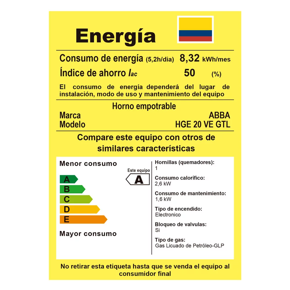 El horno empotrable Abba HGE 20 VE GTL EAH está diseñado para ofrecer practicidad, eficiencia y una apariencia moderna. Su funcionamiento a gas propano lo convierte en una excelente opción para hogares sin conexión a gas natural.