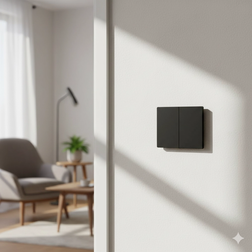 Este interruptor cuenta con dos módulos independientes, una estructura de hierro robusta, cuerpo de cobre y policarbonato y tapa de vidrio templado negro. Su montaje incrustado permite una instalación discreta, mientras que soporta hasta 10 A a 100‑240 V y 50/60 Hz.