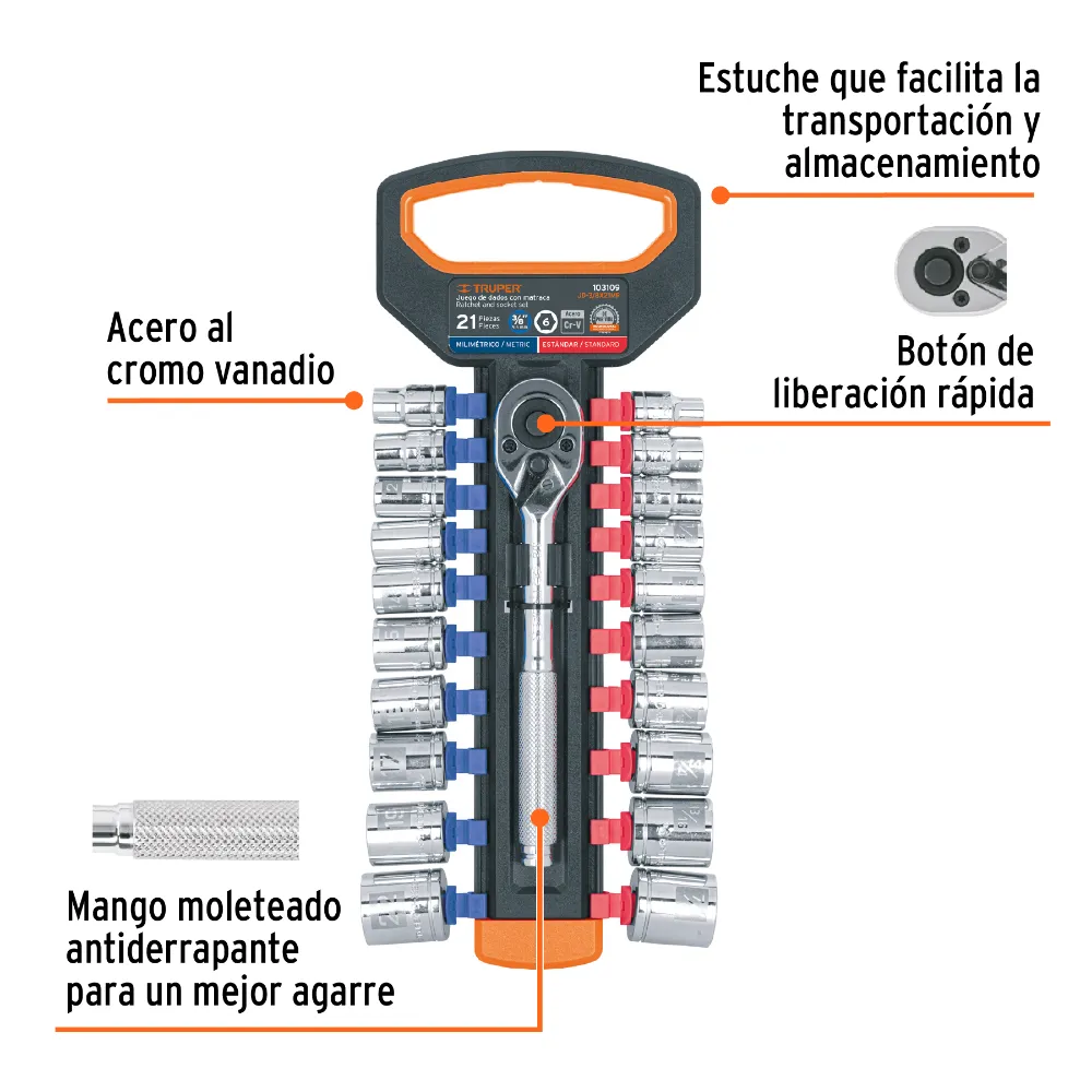 Incluye 10 dados de las medidas más populares (desde 5/16″ hasta 7/8″), organizados en un estuche práctico que facilita su transportación y almacenamiento, manteniendo tu espacio de trabajo ordenado. Cada pieza está marcada para una identificación inmediata.