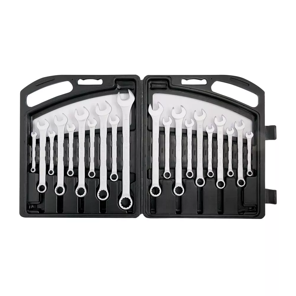 20 llaves combinadas con medidas desde las más pequeñas hasta medianas, perfectas para mantenimiento automotriz e industrial.