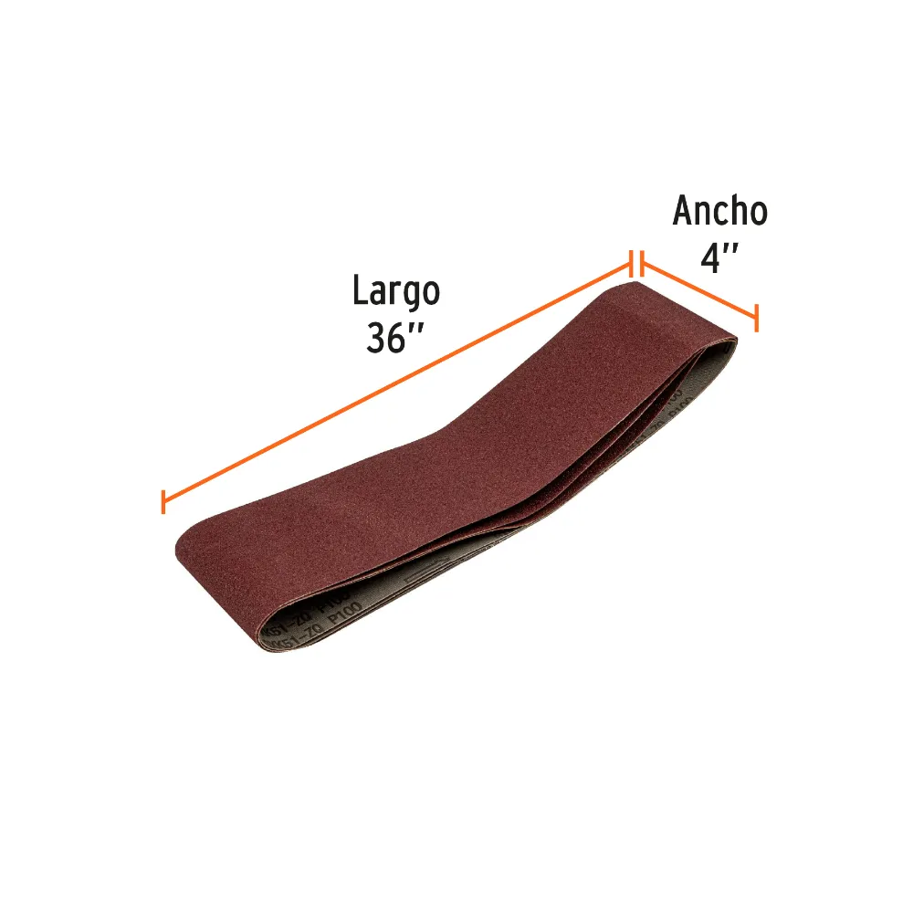 Con un tamaño de grano 100, son perfectas para trabajos de desbaste y eliminación de material. Sus dimensiones de 4″ de ancho x 36″ de largo (10 cm x 90 cm) son estándar para un fácil reemplazo. Descubre más herramientas de calidad en nuestra gama de productos Truper.