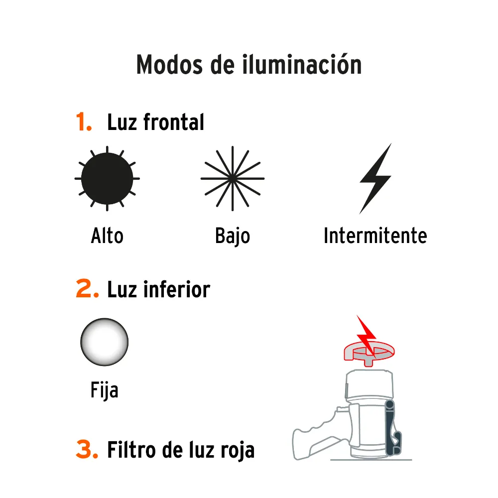 | Modos de iluminación | Frontal (alto, bajo, intermitente), luz inferior (fija) y filtro de luz roja |