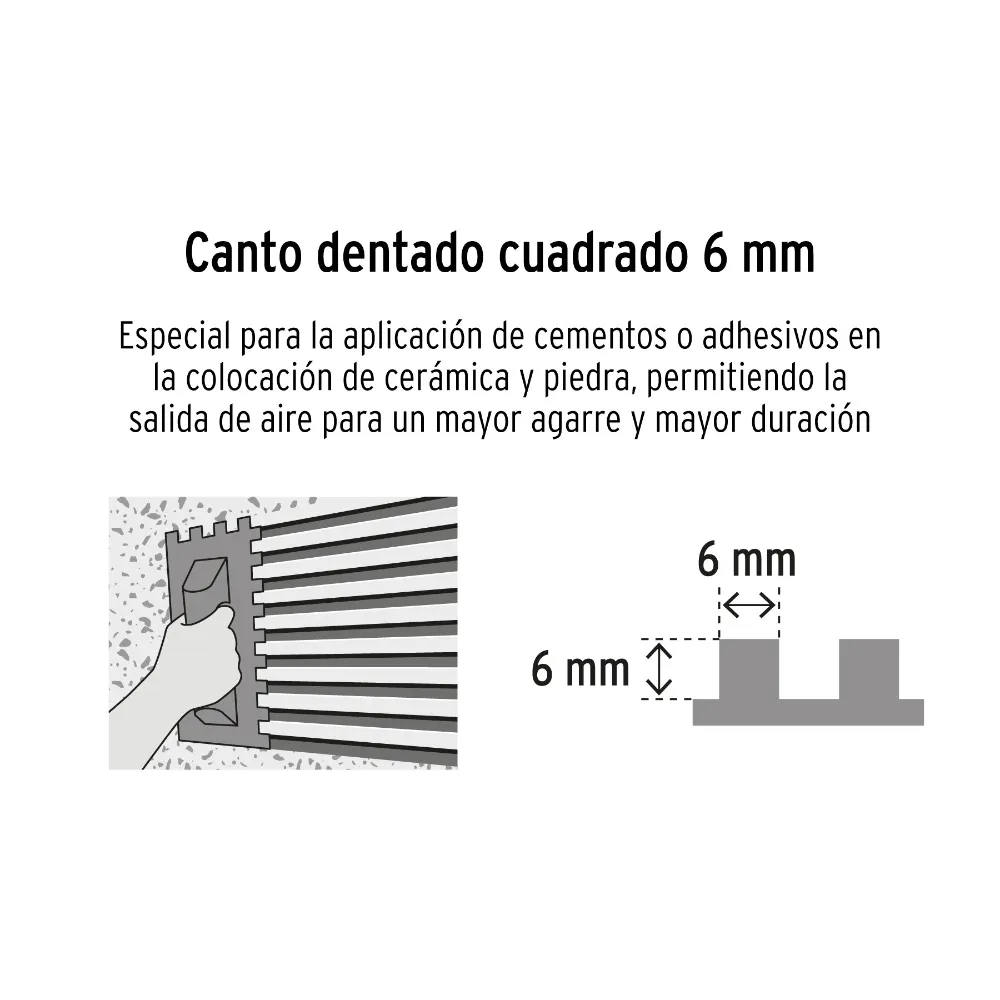 • Llana dentada 1/4″ ideal para la aplicación uniforme de adhesivos en la colocación de cerámica y piedra.