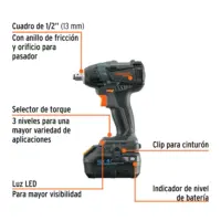 Su motor brushless (libre de carbones) elimina el mantenimiento, evita el desgaste prematuro y garantiza una mayor vida útil. El selector electrónico de 3 velocidades y torque te permite adaptar la herramienta a cada aplicación, desde tornillos M8 hasta M16, con un torque máximo de 258 lb/ft.