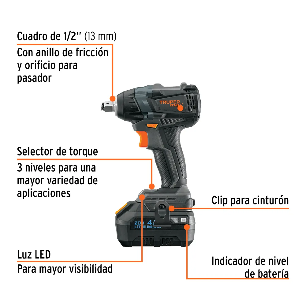 Llave De Impacto 1/2″ 20V + 1 Batería 4Ah Max Truper 101403